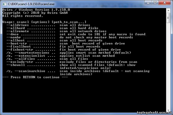 Решение Avira Command Line Scanner ScanCL позволяет легко и просто сканировать систему, используя командную строку. ScanCL работает с новым антивирусным ядром Avira AntiVir Engine, которое характеризуется еще большим коэффициентом обнаружения и скоростью сканирования. Запуск осуществляется с использованием ключей. Описание ключей и действие представлены в файле инструкции (*.pdf)