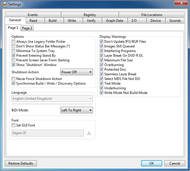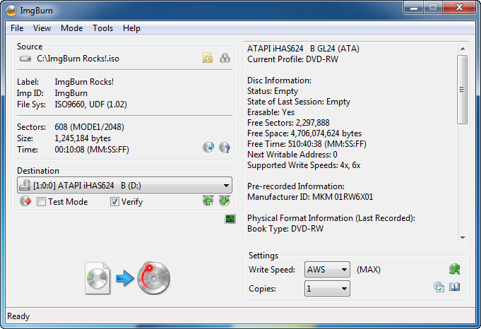 Главной особенностью ImgBurn является поддержка большого количества приводов различных производителей, поддерживает все последние накопители, включая рекордеры с возможностью изменения параметра booktype / bitsetting (от BenQ, LiteOn, NEC, Plextor, Sony). ImgBurn имеет ряд настроек, где можно задать ассоциацию с поддерживаемыми расширениями файлов-образов (BIN, GCM, LST, UDI, CDI, FI, MDS, CDR, IMG, NRG, DVD, ISO, PDI), выбрать интерфейс записи (ASPI, ASAPI, SPTI). Помимо всего перечисленного, в ImgBurn можно проводить верификацию данных на носителях, анализировать качество записи и получать различного рода сведения, как о диске, так и о физической его структуре. Присутствует возможность осуществлять поиск в Интернет и последующую загрузку новых версий прошивок для данного привода. Можно изменять метку ISO-образа, блокировать/разблокировать открытие лотка привода и т.д. Очистка дисков поддерживается как быстрая, так и полная. Русский интерфейс придется скачать отдельно (файл из архива нужно разместить в папку \Program Files\ImgBurn\Languages).