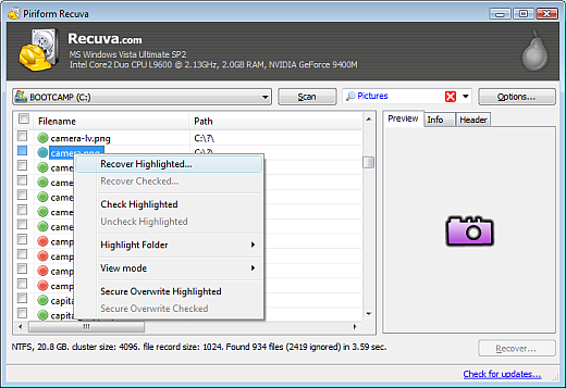 Recuva - небольшая бесплатная утилита, которая предназначена для восстановления файлов, удаленных с ПК случайно или потерянных в результате программного сбоя или ошибки в работе приложений. Проста в использовании, не требует от пользователя специальных знаний в области восстановления данных. Процесс поиска и восстановления файлов организован очень просто, как впрочем, и сам интерфейс программы. Recuva сканирует выбранный диск (поддерживаются как жесткие диски, так и flash-накопители), после чего выводит список всех удаленных файлов и рядом отображает примерный статус вероятности восстановления. После флажками отмечаются необходимые и производится восстановление. Интерфейс программы - многоязычный.